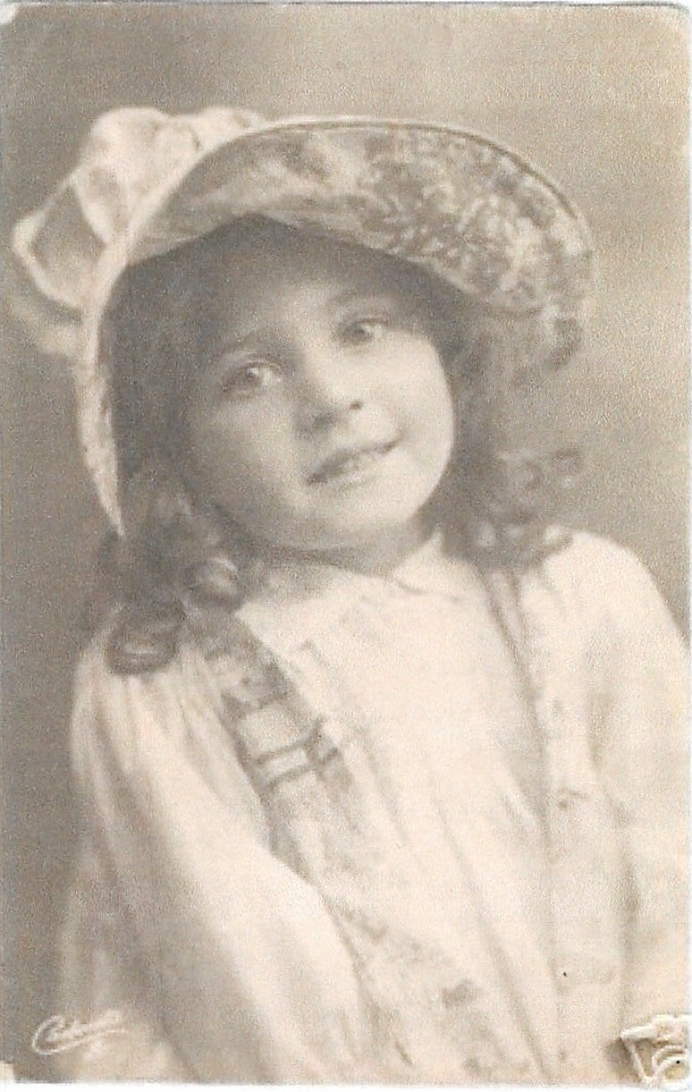 head & shoulders study of young curly haired girl with embroidered dress & hat, lips apart, faces slight right, looks front