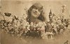 girl poses facing left, looking up and right, flowers surround, hands not seen