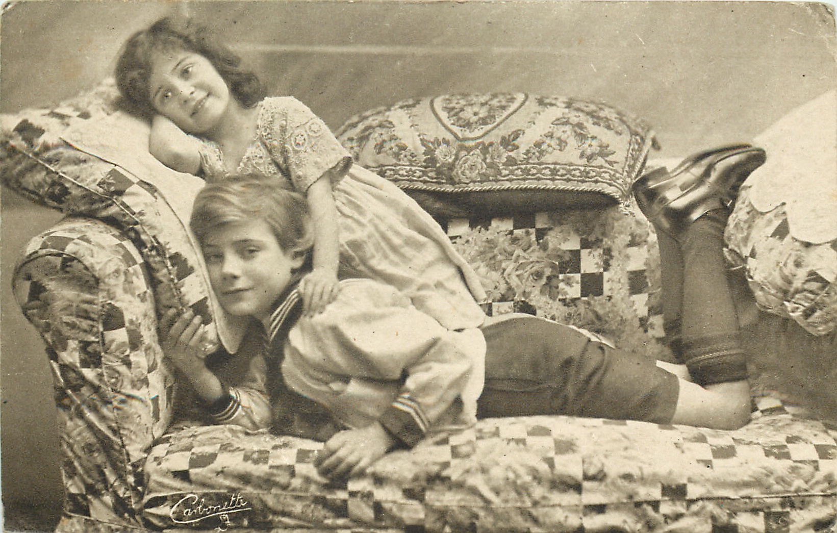 boy & girl on couch, boy lies on his stomach left, girl above, her left hand on his shoulder
