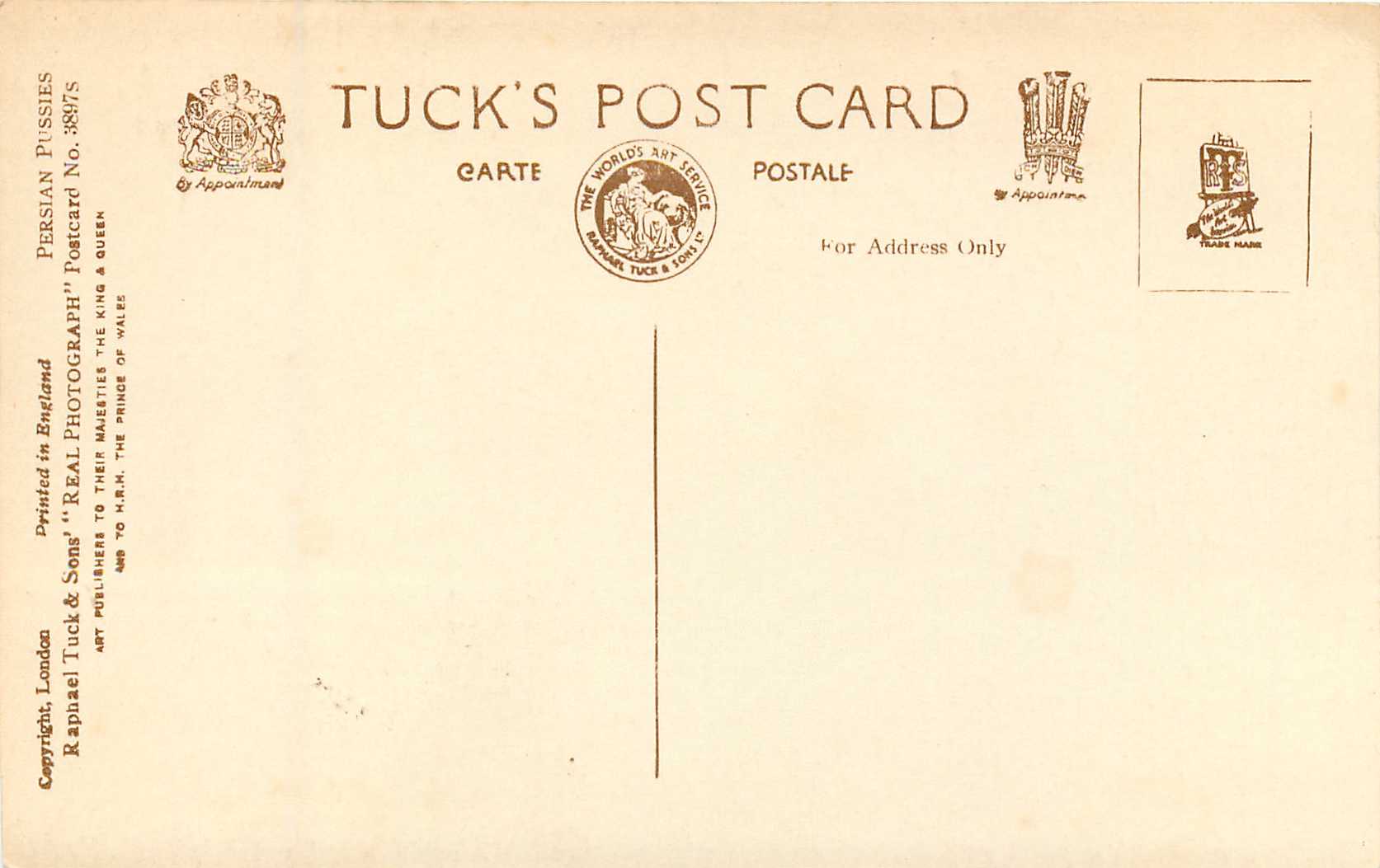 REAL PHOTOGRAPH, PRINTED IN ENGLAND, COPYRIGHT LONDON, comes also with A PERSIAN PUSSY in the set title position, packet number 608, comes with card letters, 2 backs