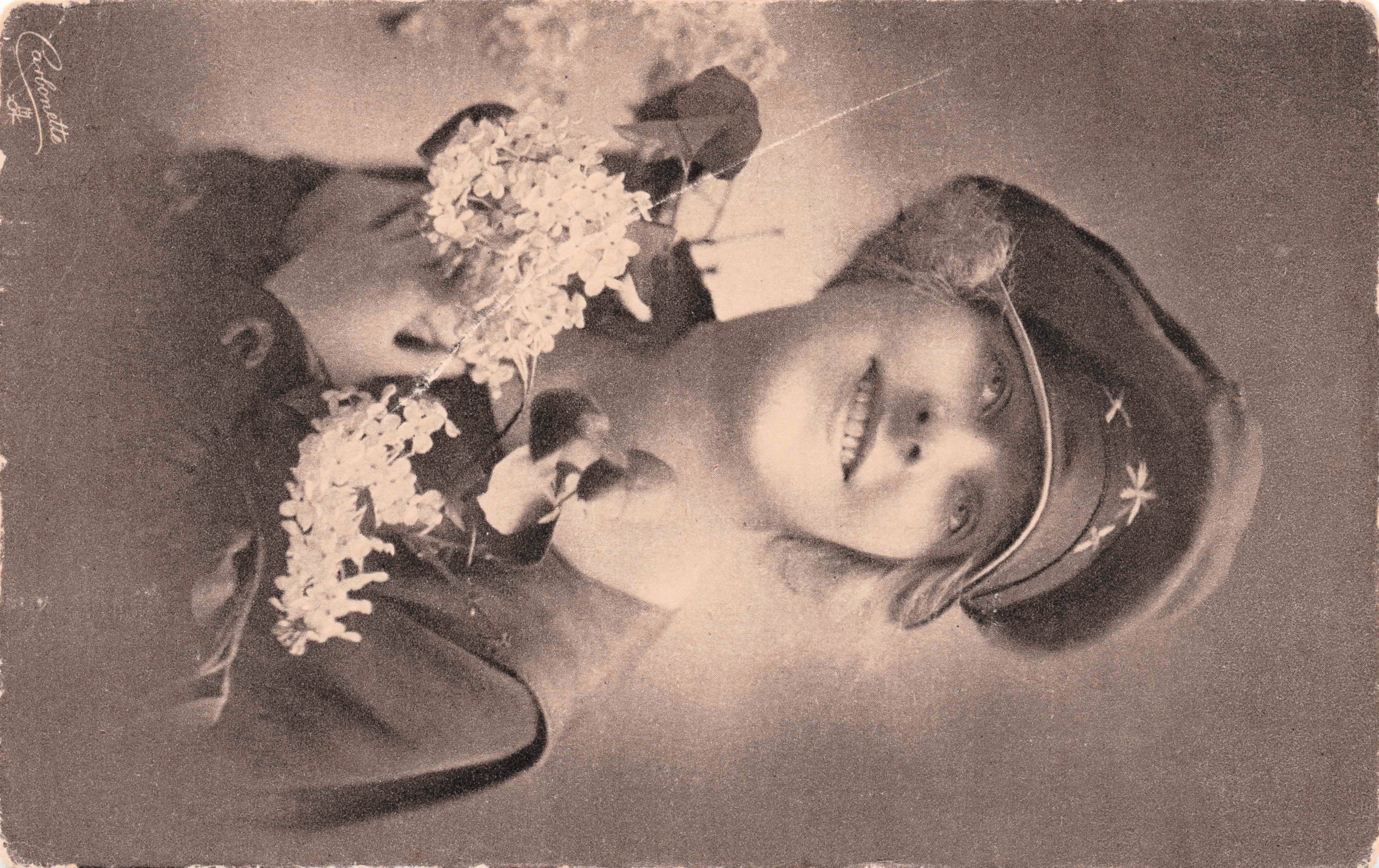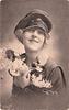 woman with hat that has three star designs on brim holds lilacs to chest with both hands, she faces half left & looks up