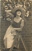 pretty girl in striped dress with large hat sits on stepladder in front of wall, faces forward looks right, left elbow leans on ladder top, right arm behind head
