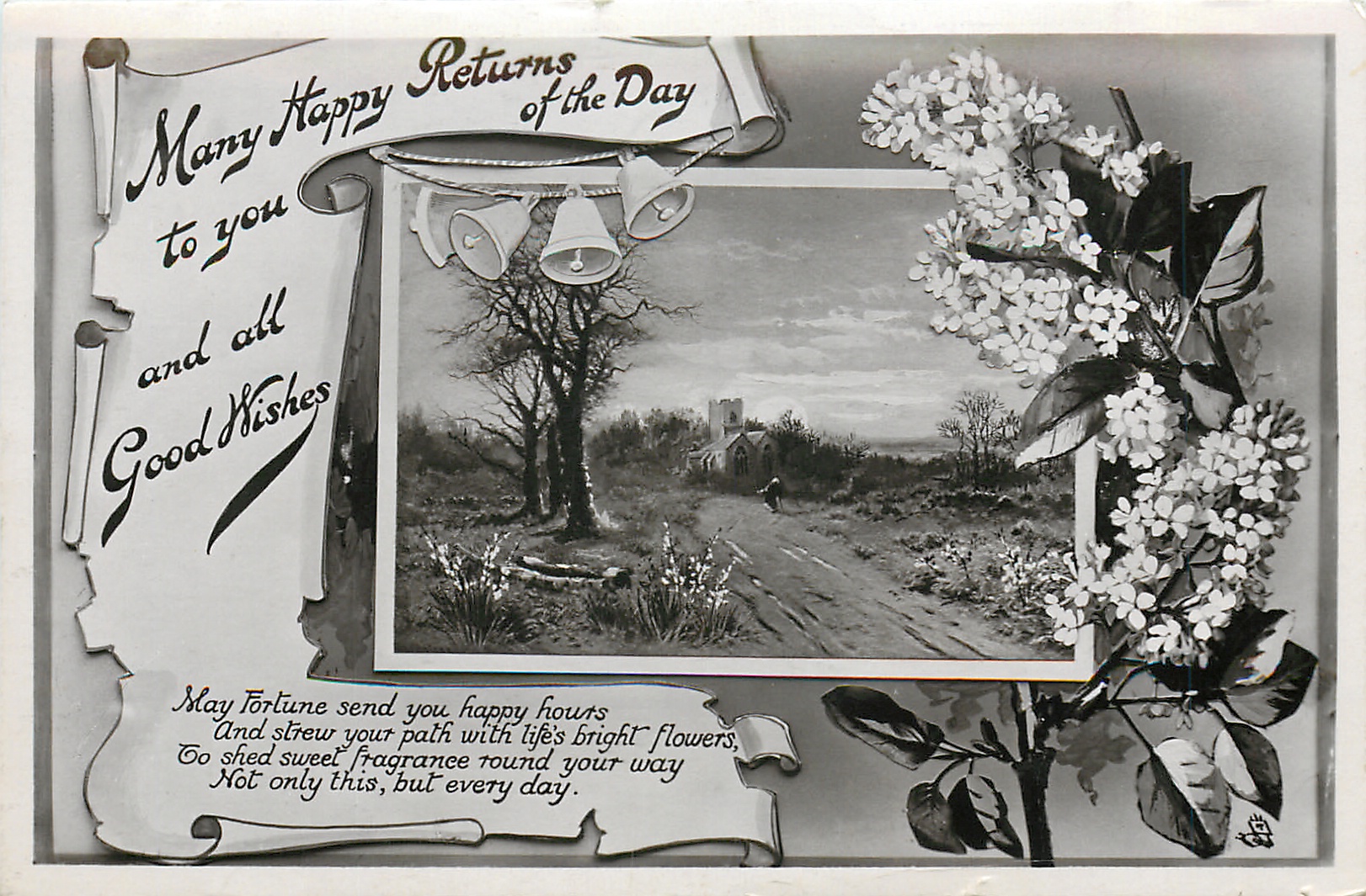 verse:- MAY FORTUNE SEND YOU HAPPY HOURS AND STREW YOUR PATH WITH LIFE'S BRIGHT FLOWERS, TO SHED SWEET//DAY.