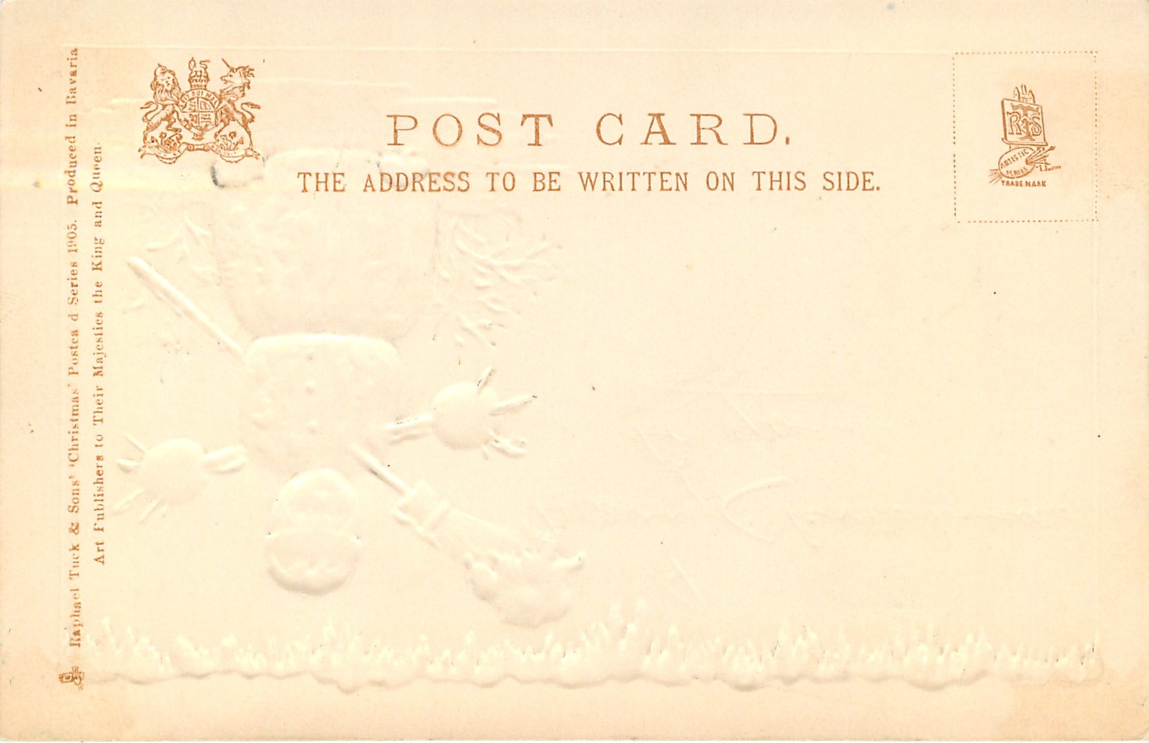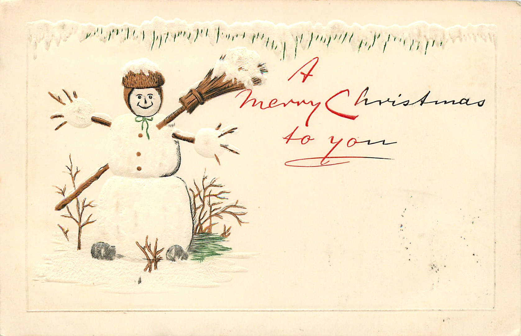 A MERRY CHRISTMAS TO YOU smiling snowman, left, with broom