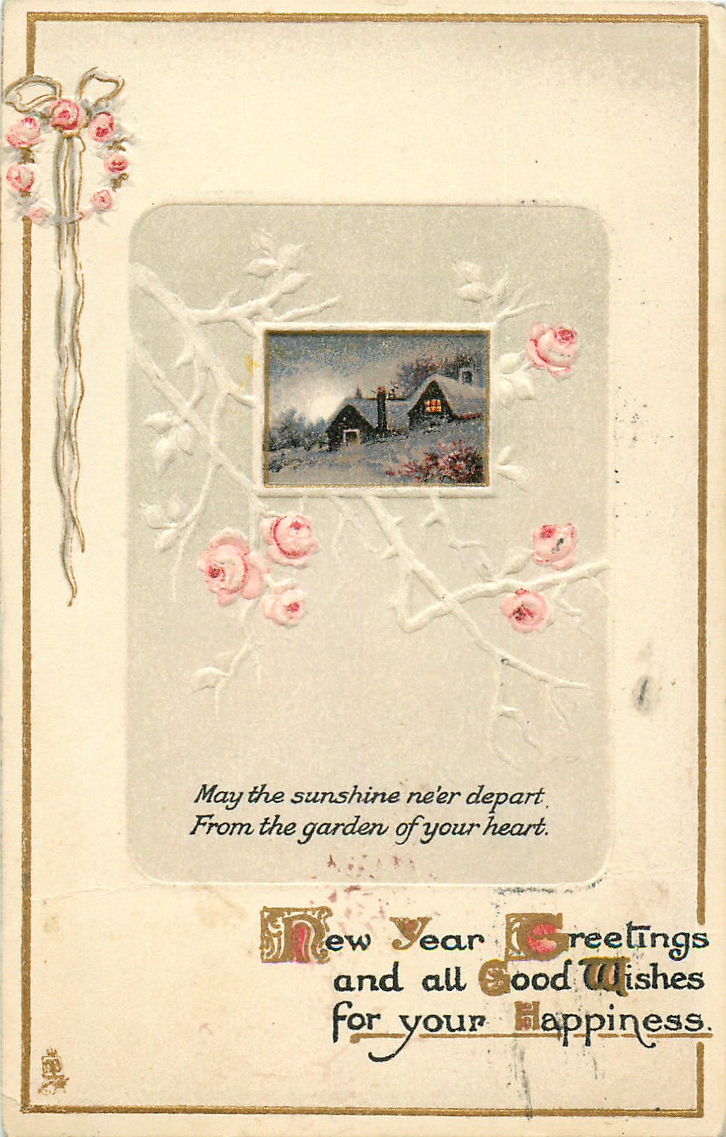 NEW YEAR GREETINGS AND ALL GOOD WISHES FOR YOUR HAPPINESS small inset, cottages, roses around