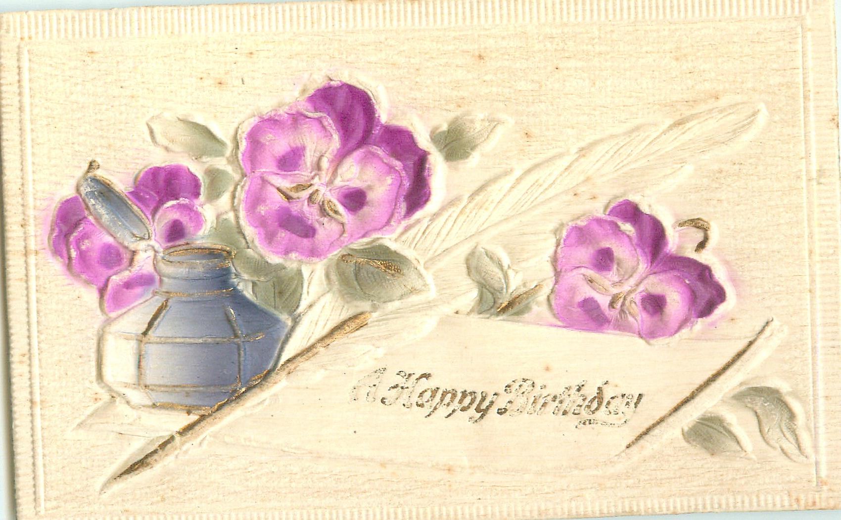 A HAPPY BIRTHDAY purple pansies, blue pot left