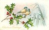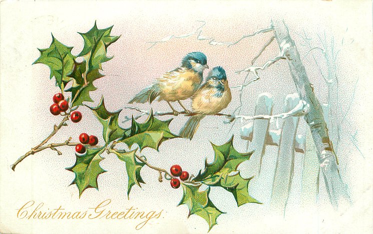 CHRISTMAS GREETINGS holly front left, two blue-tits centrally wintery tree & fence right
