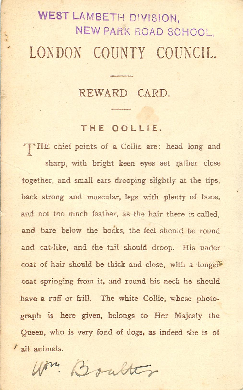 LONDON COUNTY COUNCIL REWARD CARD with much back information, ANIMAL STUDIES by GAMBIER BOLTON