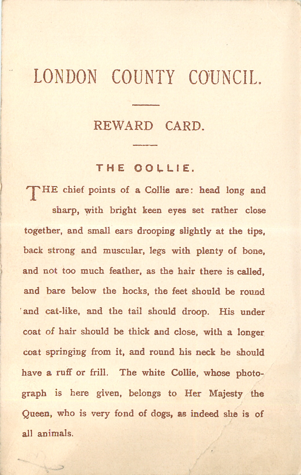 back:- THE COLLIE. THE CHIEF POINTS OF THE COLLIE ARE: HEAD LONG AND SHARP, WITH BRIGHT KEEN EYES SET RATHER CLOSE TOGETHER, AND SMALL EARS DROOPING SLIGHTLY AT THE TIPS//ANIMALS