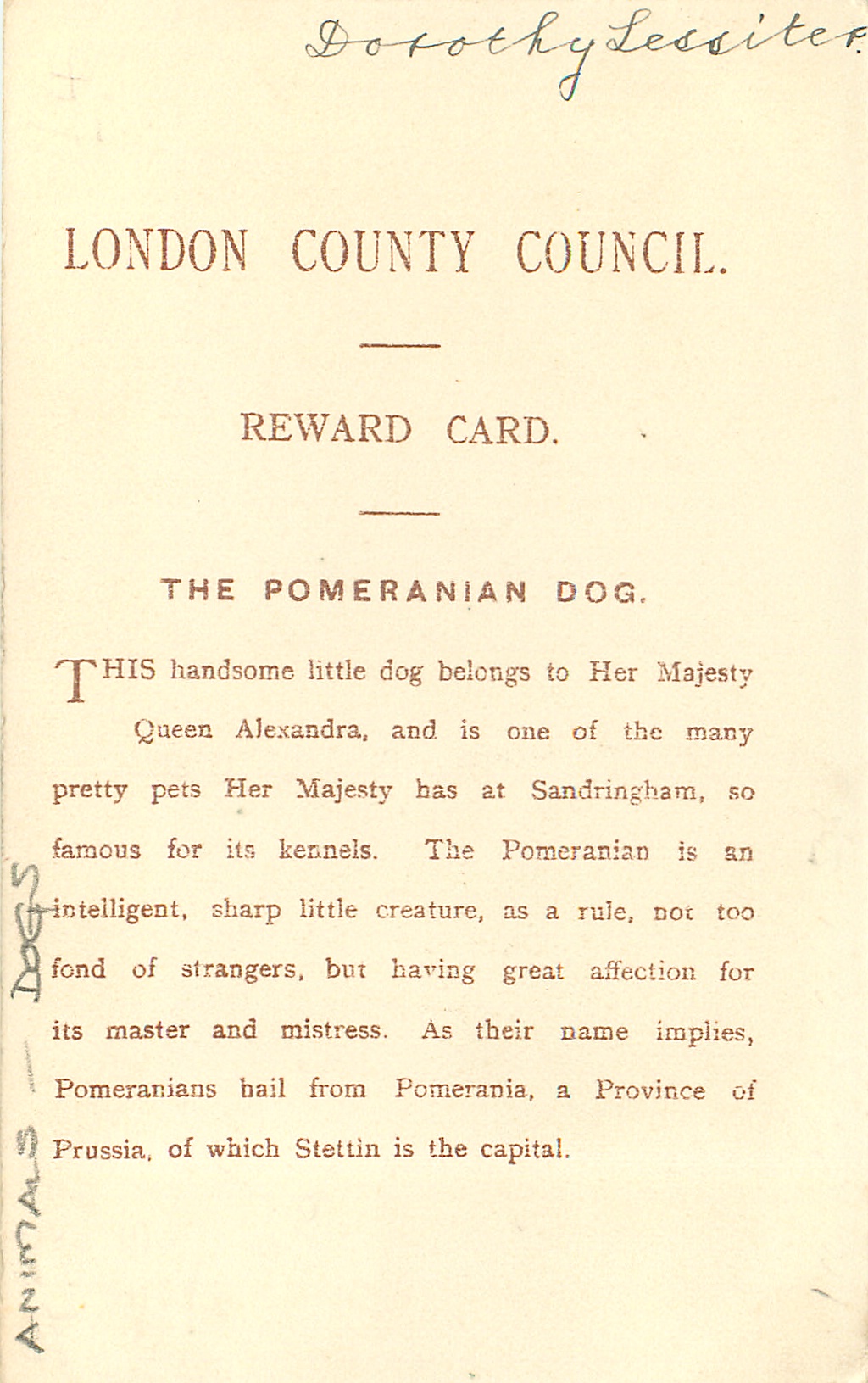 LONDON COUNTY COUNCIL REWARD CARD with much back information, ANIMAL STUDIES by GAMBIER BOLTON