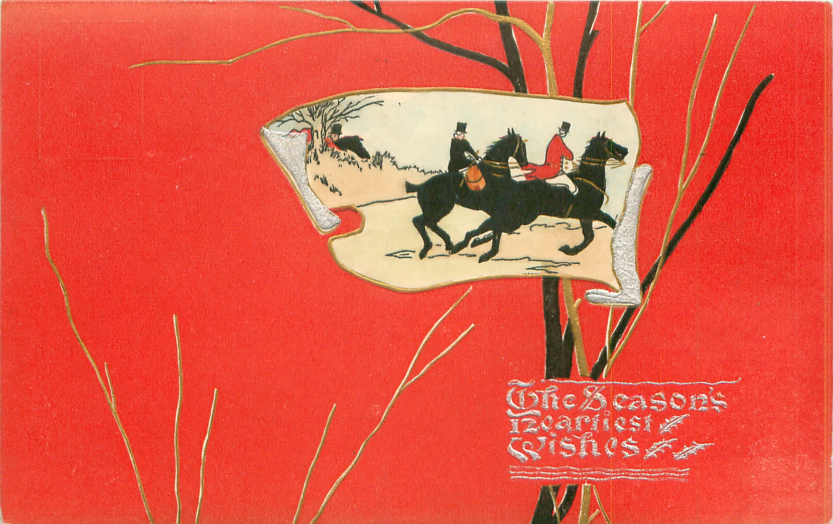 inset to right of card of huntsman & huntswoman riding right fast, red background