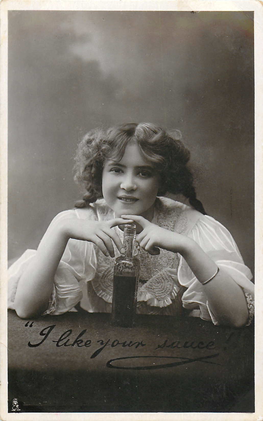 "I LIKE YOUR SAUCE!" young girl sitting behind liquor bottle, she has braids in hair