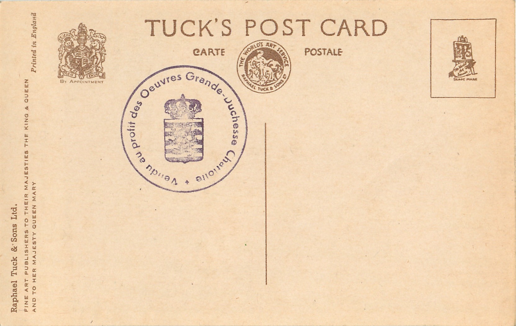 sepia, PRINTED IN ENGLAND, set produced during World War II, most have purple stamp on back VENDU AU PROFIT DES OEVRES GRANDE- DUCHESSE CHARLOTTE around arms of Luxembourg