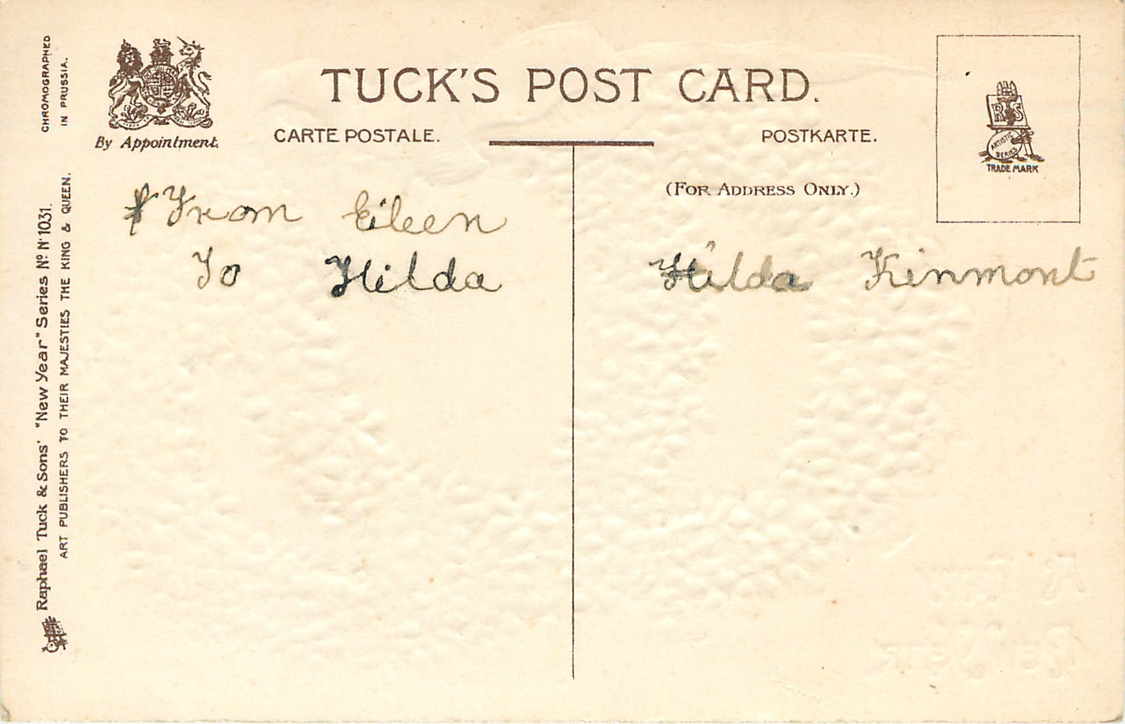 gilt embossed, CHROMOGRAPHED IN PRUSSIA, same images with Xmas greetings C 1031