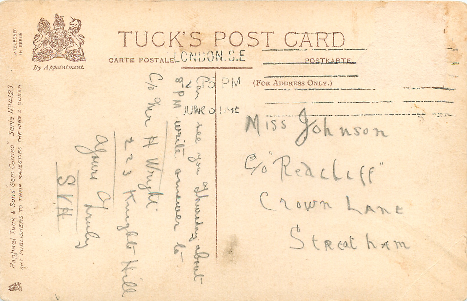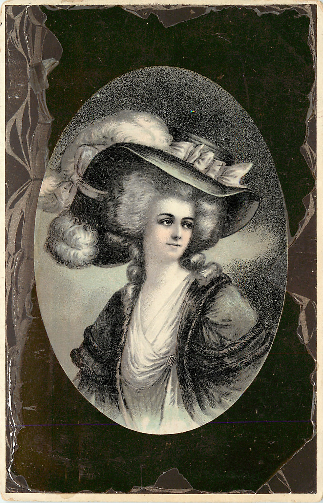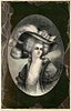 oval insert of lady with elaborate ostrich feathered hat looking right, brown surround