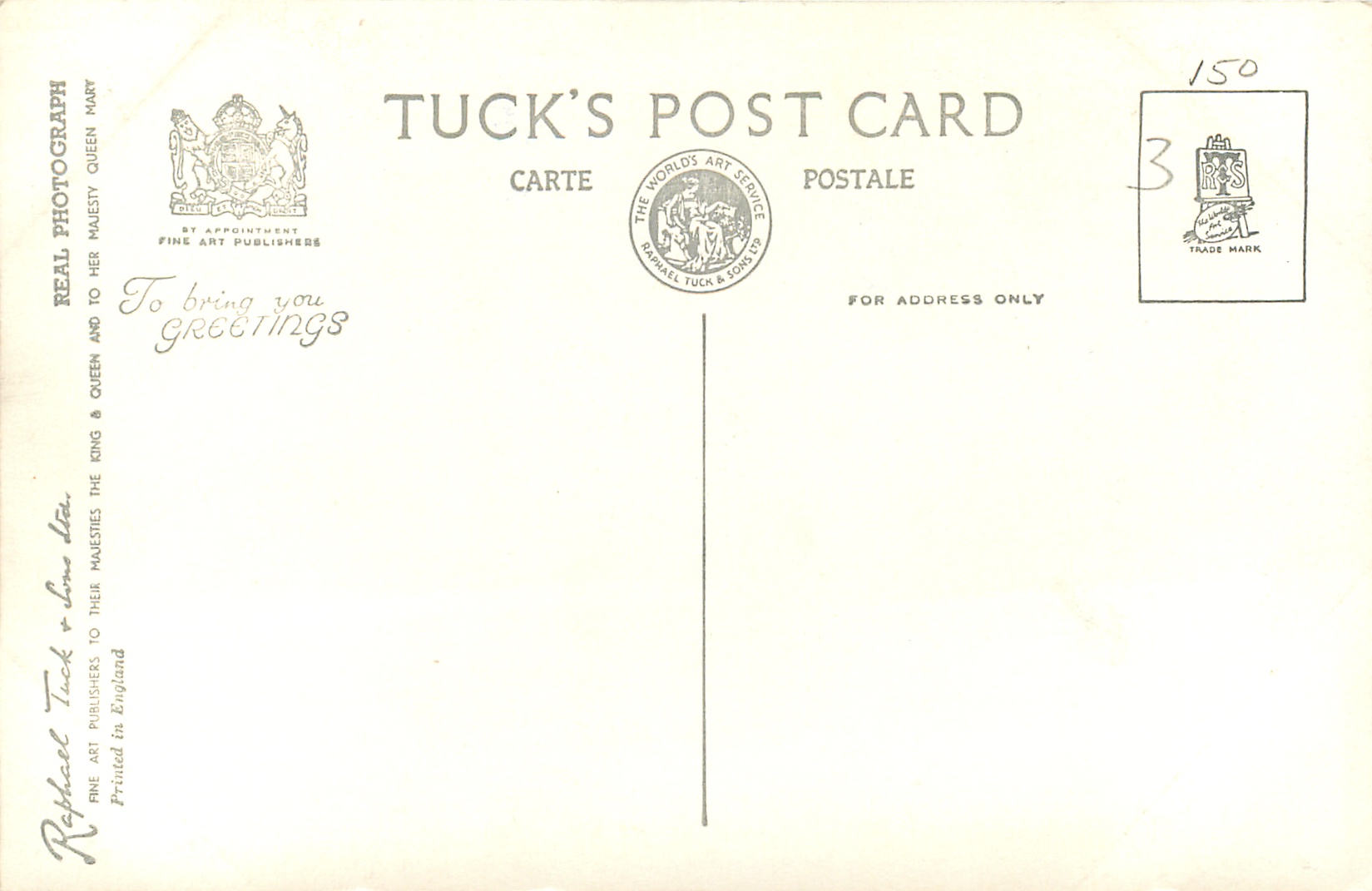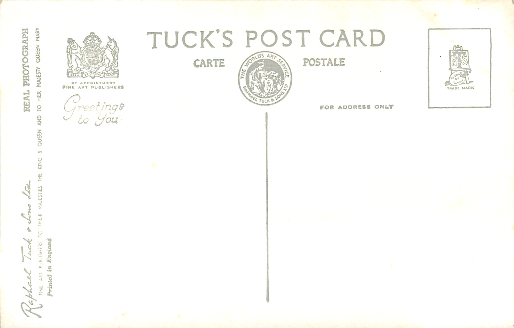 REAL PHOTOGRAPH, PRINTED IN ENGLAND, GREETINGS TO YOU or TO BRING YOU GREETINGS on back, A TUCK CARD on front