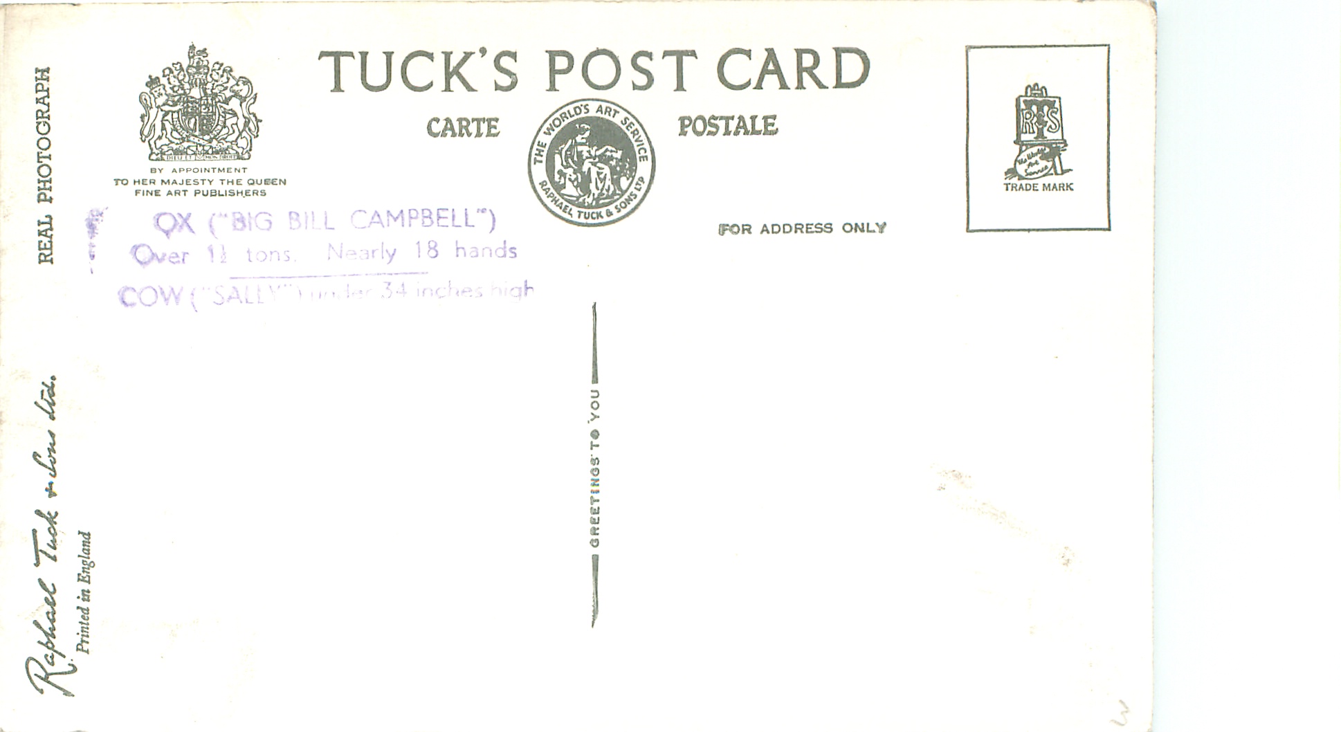 PRINTED IN ENGLAND, REAL PHOTOGRAPH GREETINGS TO YOU, card title & information with purple handstamp