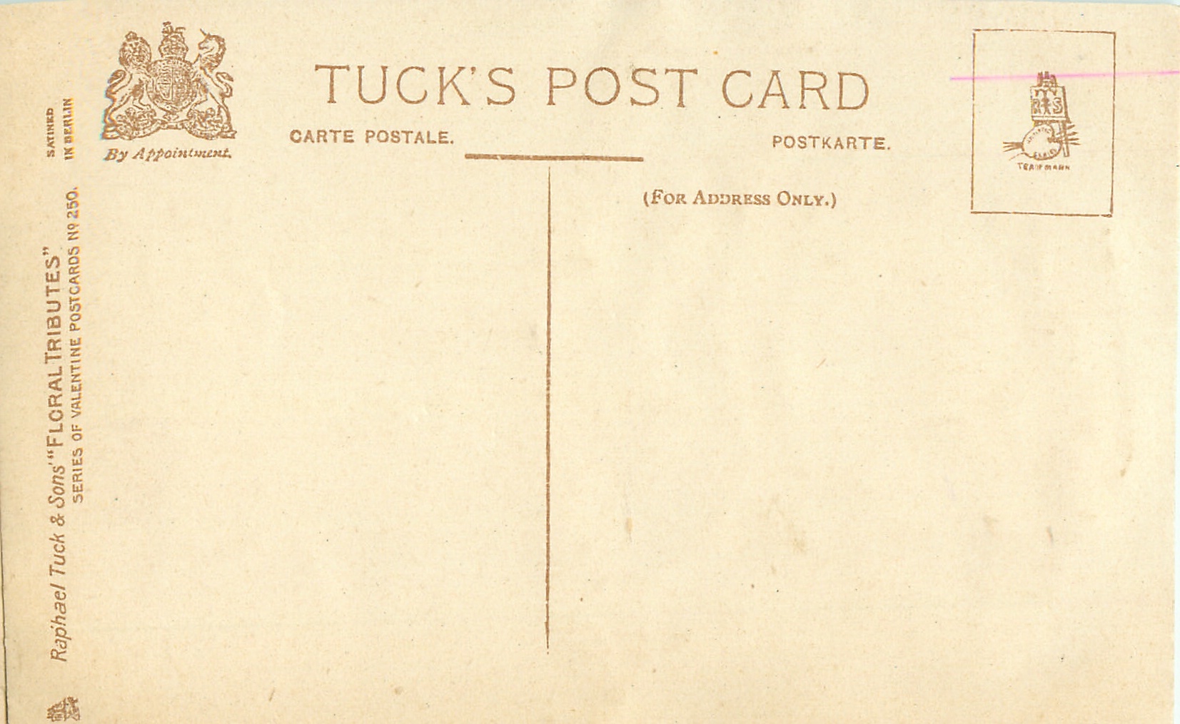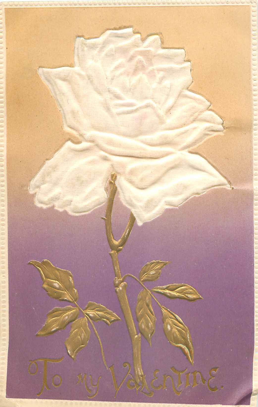 VALENTINE, front heavily embossed, gilt leaves, stem & title, SATINED IN BERLIN, same flowers come with different colouration & inscription