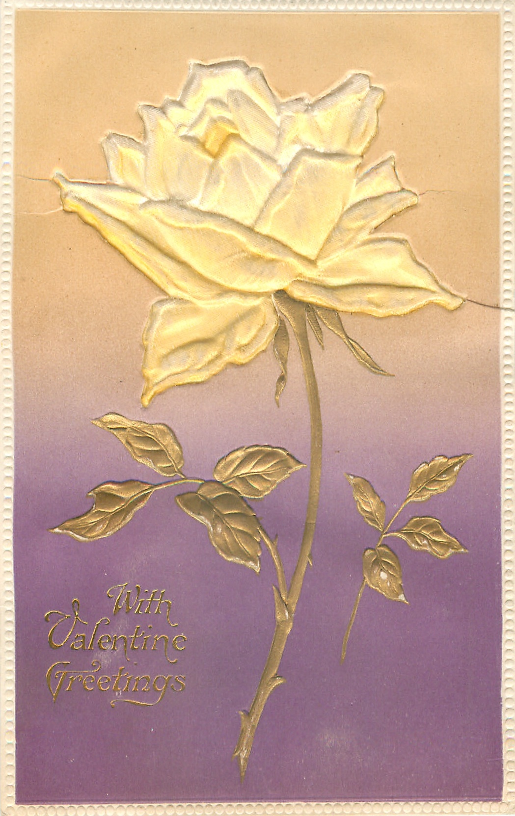 WITH VALENTINE GREETINGS yellow rose, bronze/purple background
