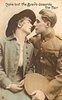 solider and woman embracing, solider right, woman left, solider holding hat in lap with left hand