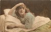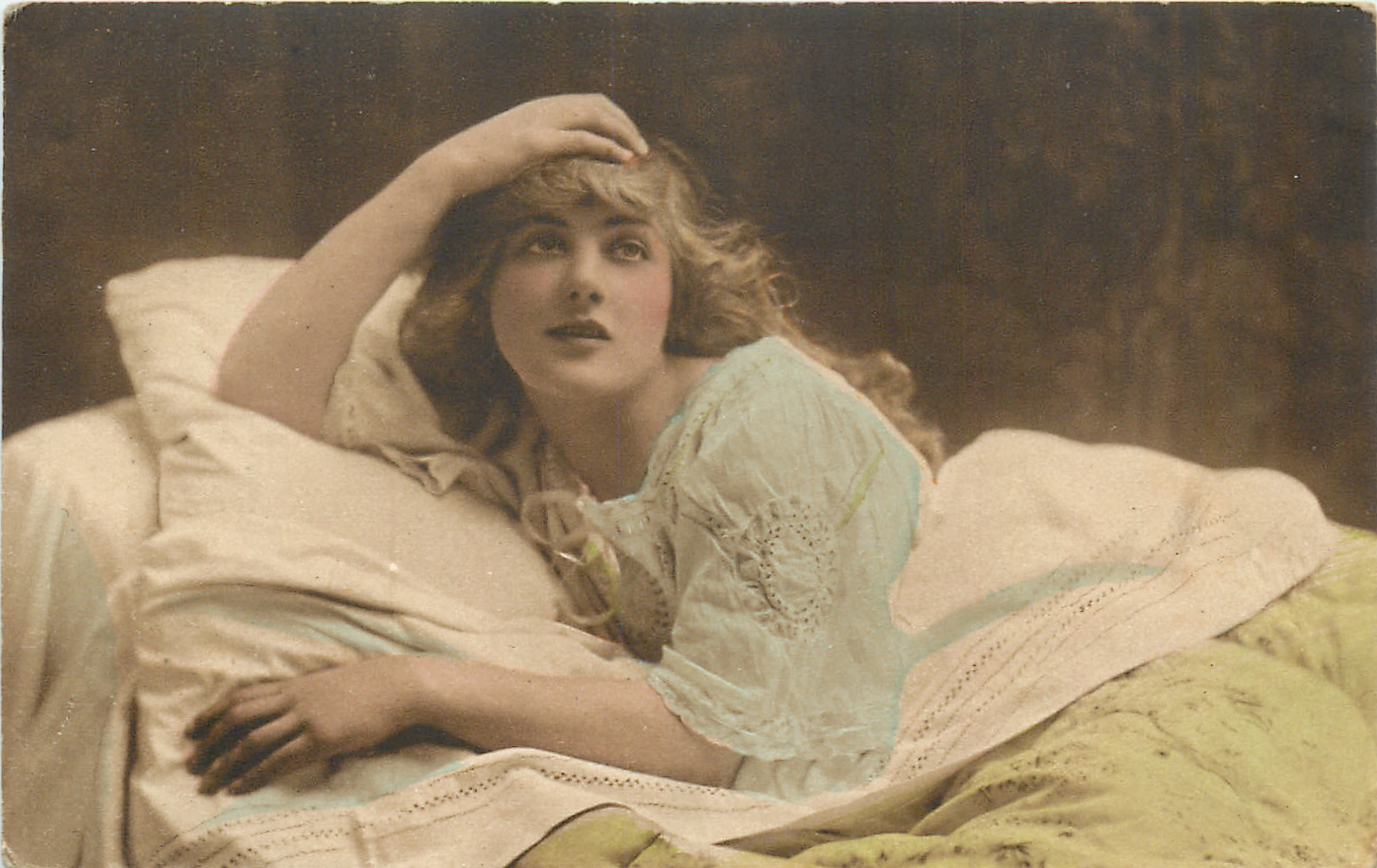 girl on bed, pillow left, her right hand on top of her head