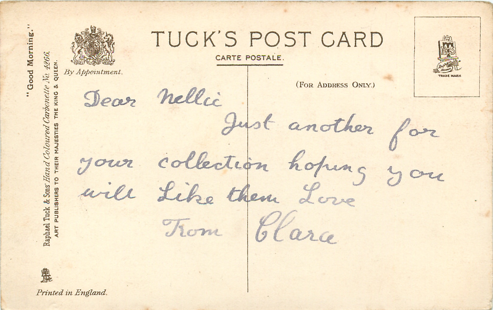 HAND COLOURED CARBONETTE, PRINTED IN ENGLANDfor same images not HAND COLOURED see 4294, info from packets 4571 & 4634