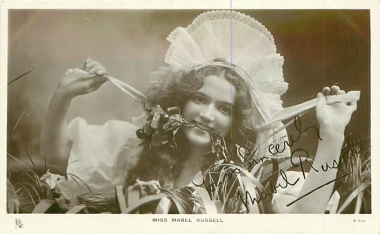 with facsimile autograph Mabel Russell (1887-1951) Got Married in 1911 & 3 mo's later Her husband Stanley Rhodes driver had accident & was killed. she was badly injured & passenger Mable Green was also injured.