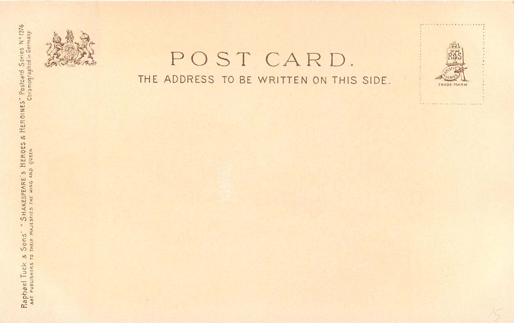 u/b, CHROMOGRAPHED IN GERMANY, SERIES I. on packet, not on cards, quotes from play at bottom of each card, listed in 1904 & 1908/1909 & 1911/1912 Postcard Catalogues