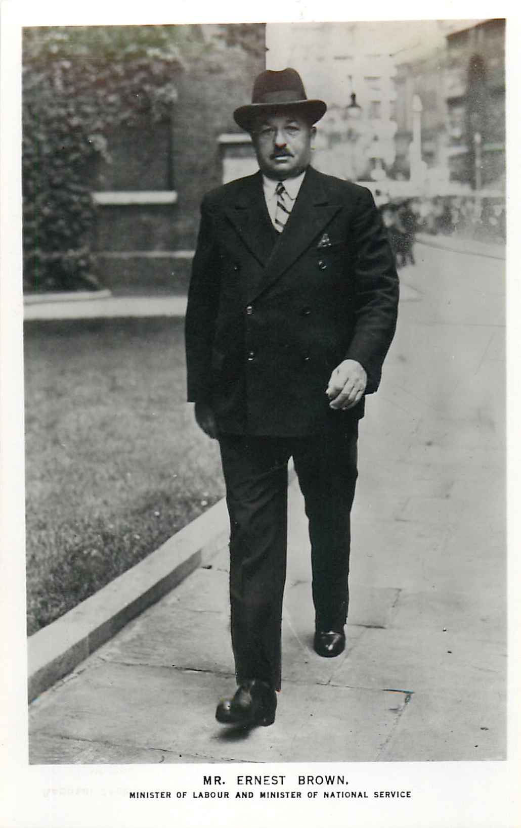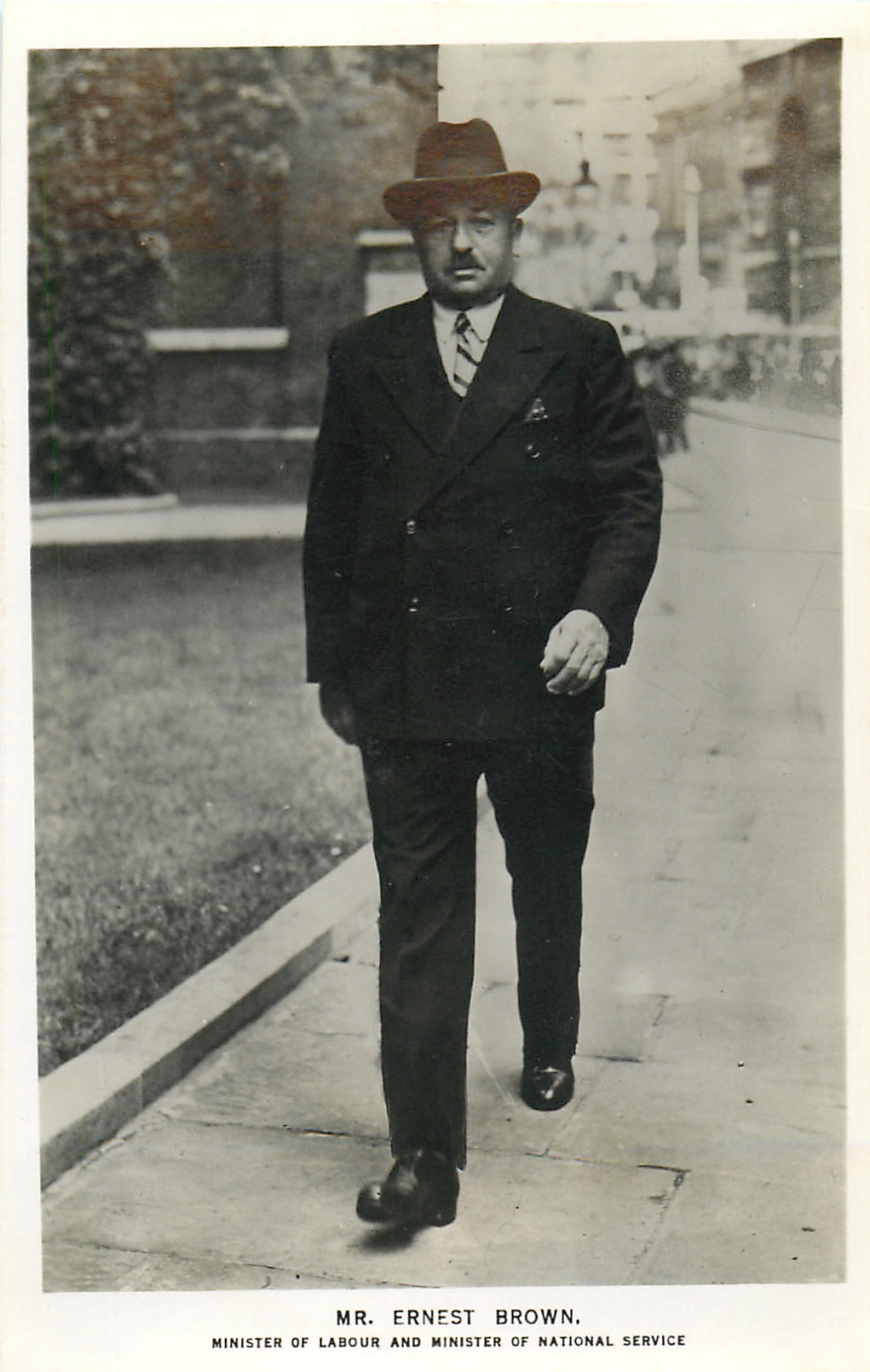 MR. ERNEST BROWN, MINISTER OF LABOUR AND MINISTER OF NATIONAL SERVICE walking on street, full length study, dark suit, hat