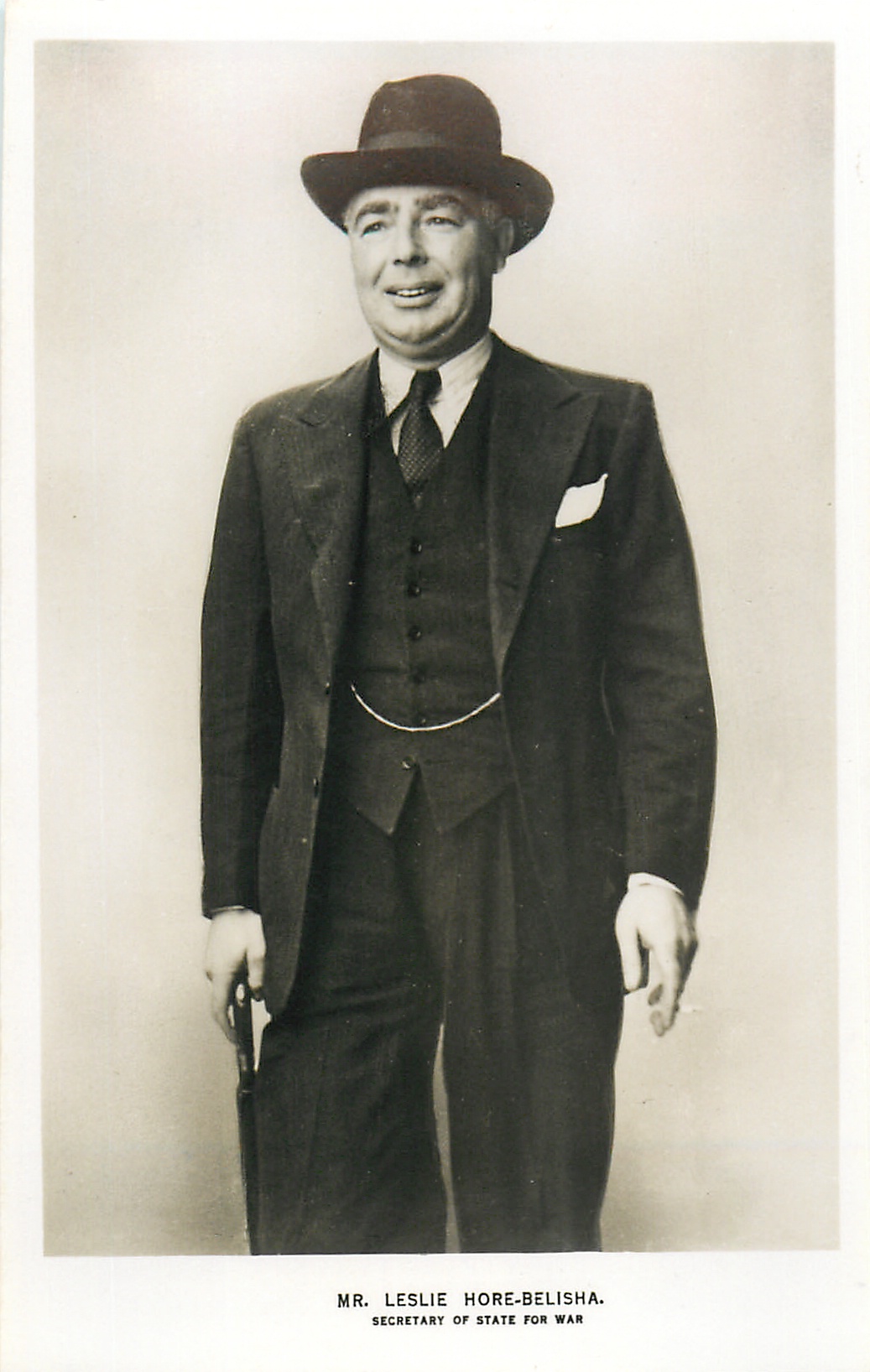 MR. LESLIE HORE-BELISHA, SECRETARY OF STATE FOR WAR wearing suit, cigarette in left hand, something in other hand