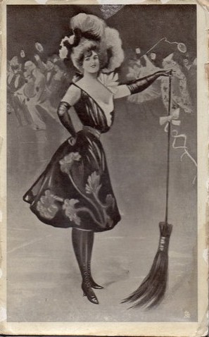Pierrette stands facing half right holding broom, clowns in background