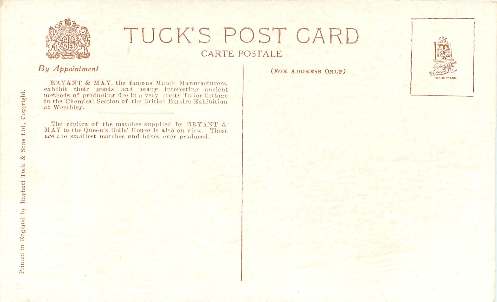 back:- BRYANT & MAY, THE FAMOUS MATCH MANUFACTURERS EXHIBIT THEIR GOODS AND MANY INTERESTING ANCIENT METHODS OF PRODUCUNG FIRE IN A VERY PRETTY TUDOR COTTAGE IN THE CHEMICAL SECTION OF THE BRITISH EMPIRE EXHIBITION AT WEMBLEY. THE REPLICA OF THE MATCHES SUPPLIED BY BRYANT & MAY TO THE QUEEN'S DOLLS' HOUSE IS ALSO ON VIEW. THESE ARE THE SMALLEST MATCHES AND BOXES EVER PRODUCED