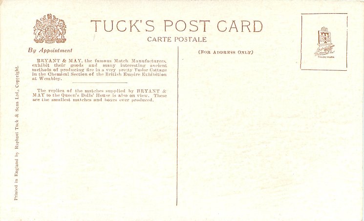 PRINTED IN ENGLAND BY RAPHAEL TUCK & SONS LTD. Oilfacsim but not so trade-named, comes with three slightly different backs see Perkins & Tonkin