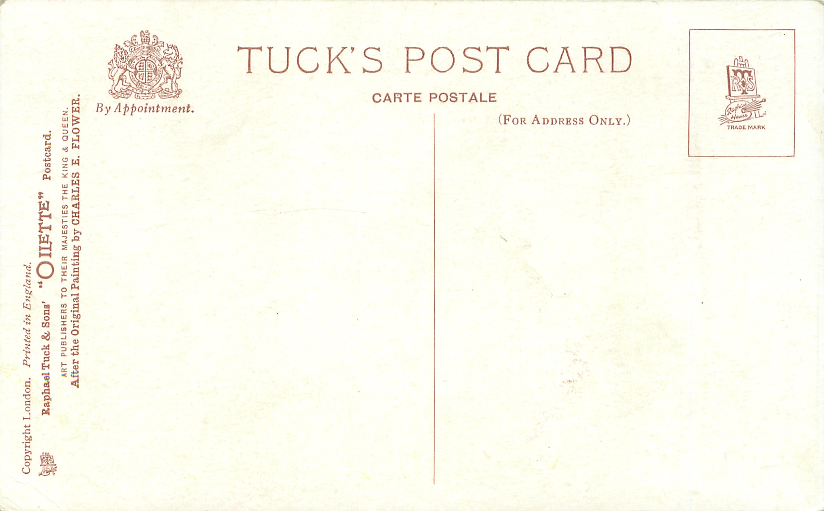 OILETTE, COPYRIGHT LONDON, PRINTED IN ENGLAND, AFTER THE ORIGINAL PAINTING BY CHARLES E. FLOWER, come as seven different printings with back changes, see Perkins &Tonkin