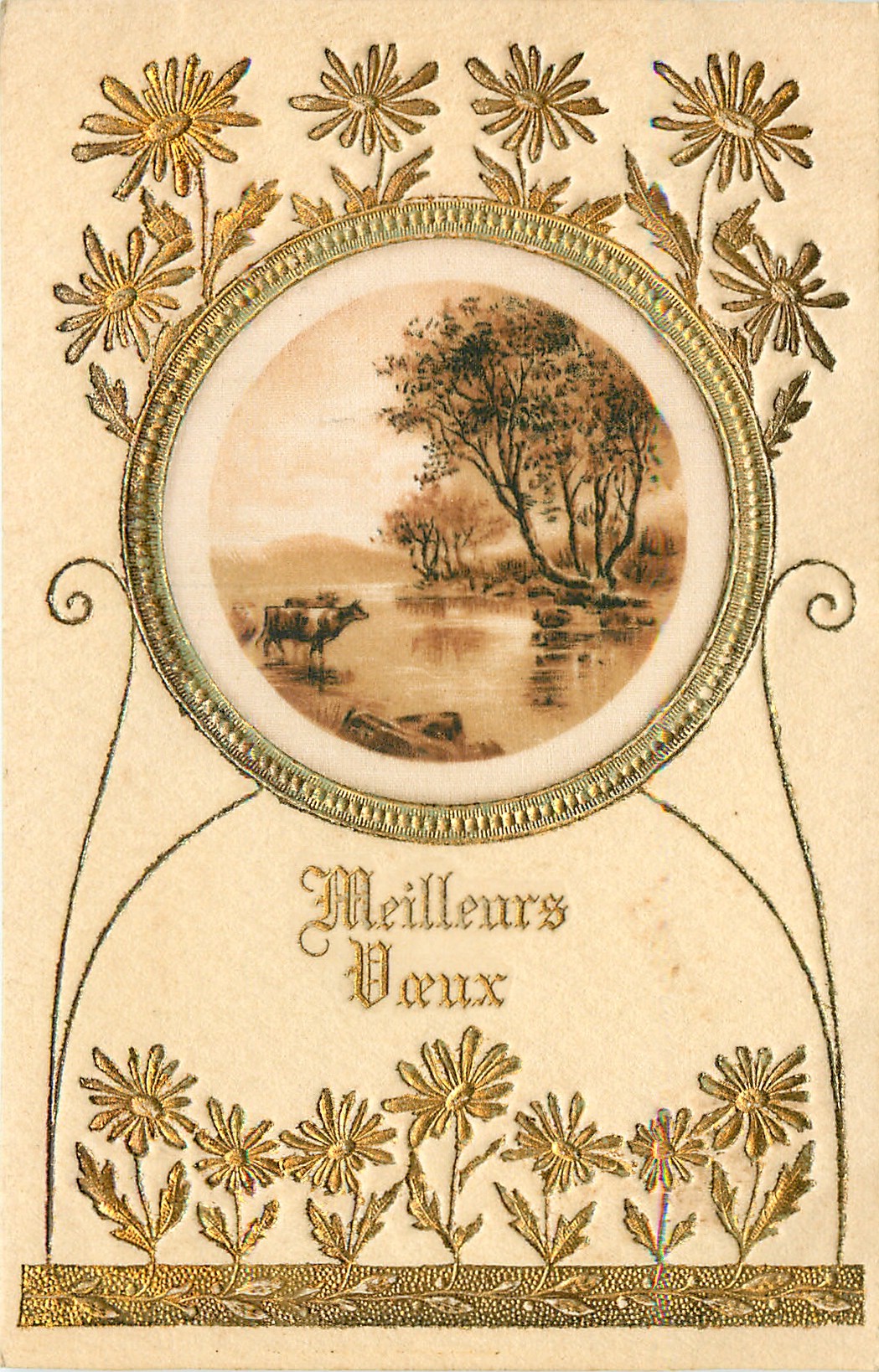 gilt embossed elaborate nouveau gilt decoration around circular silk insets, UN MOT A LA POSTE, (DEPOSE)
