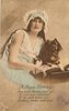 girl with frilly cap & bare arms holds pekingese on pillow, right hand touches dog, left arm cuddles dog