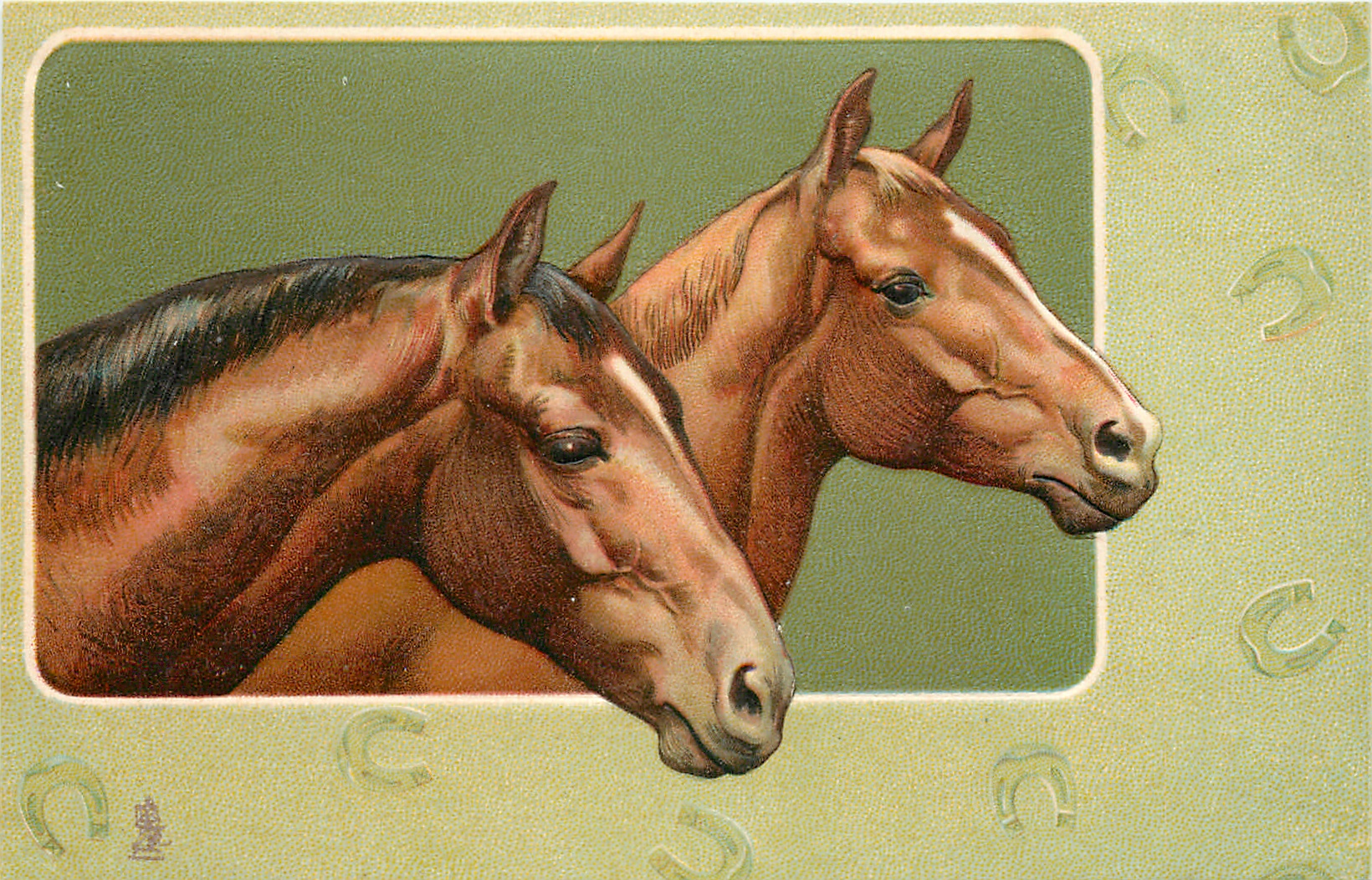 heads of two brown horses facing right in inset