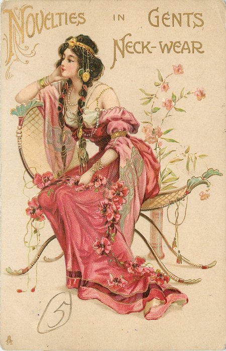 NOVELTIES IN GENTS NECK-WEAR, seated girl in pink, many ornaments