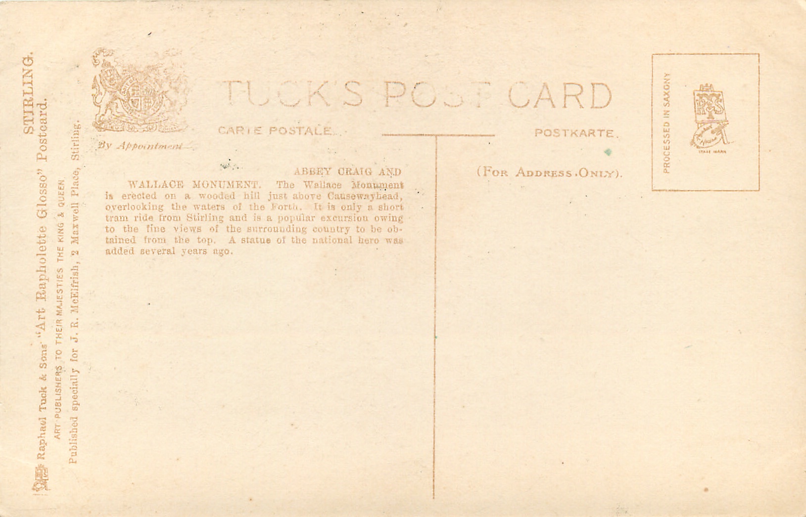ART RAPHOLETTE GLOSSO, PROCESSED IN SAXONY (in stamp box), PUBLISHED SPECIALLY FOR J.R. MCELFRISH, 2 MAXWELL PLACE, STIRLING.