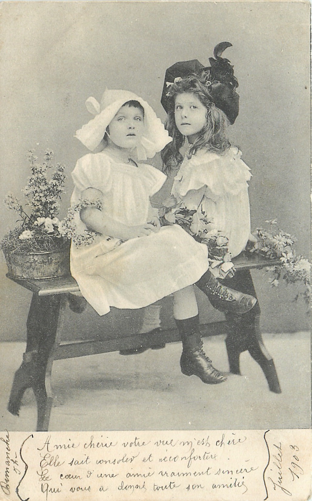 two young girls in white dresses sit on bench, girl on left faces front, girl on right faces away and looks front over her shoulder