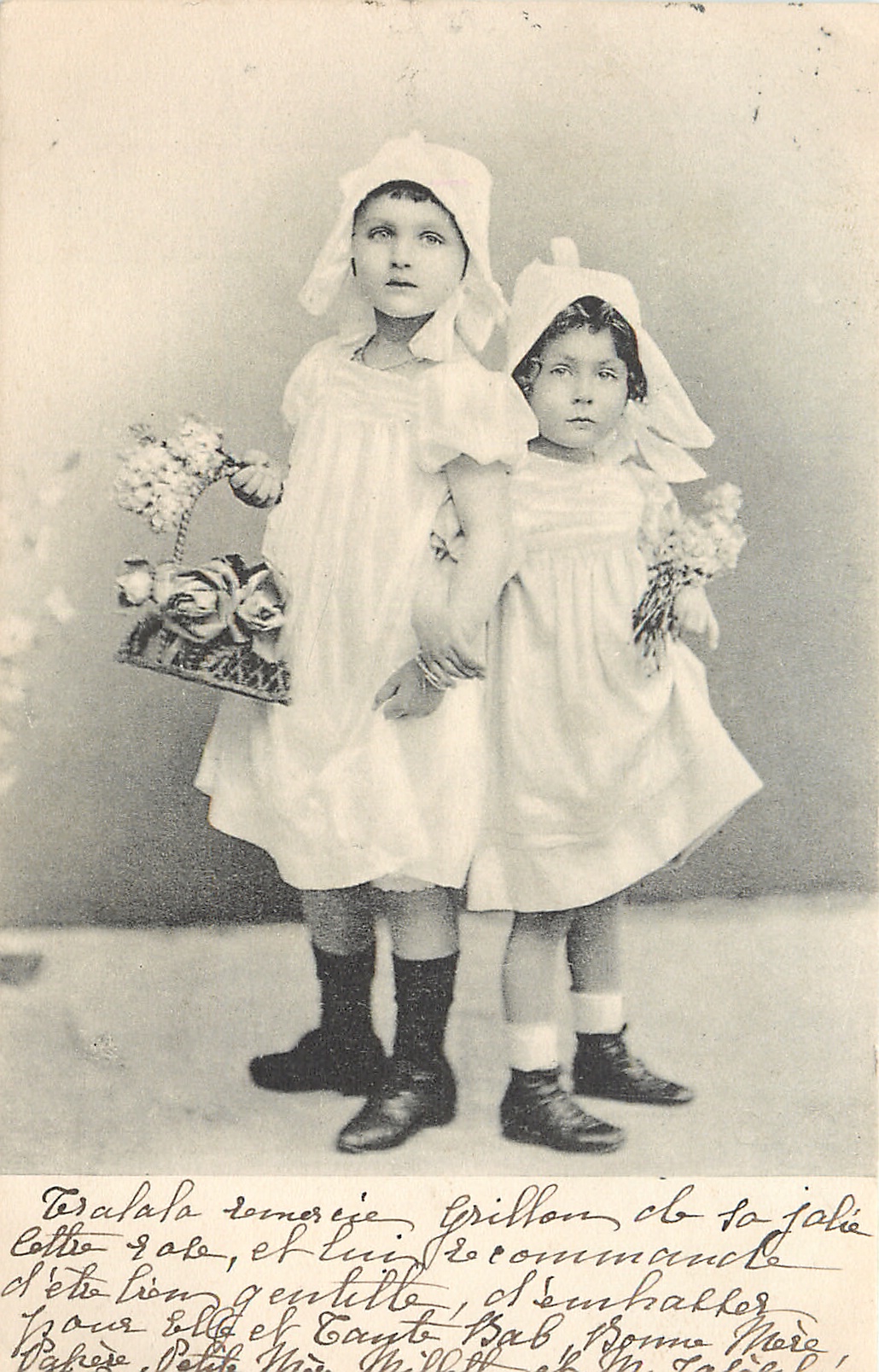 two young girls in white dresses, link arms between them & hold flowers at their sides
