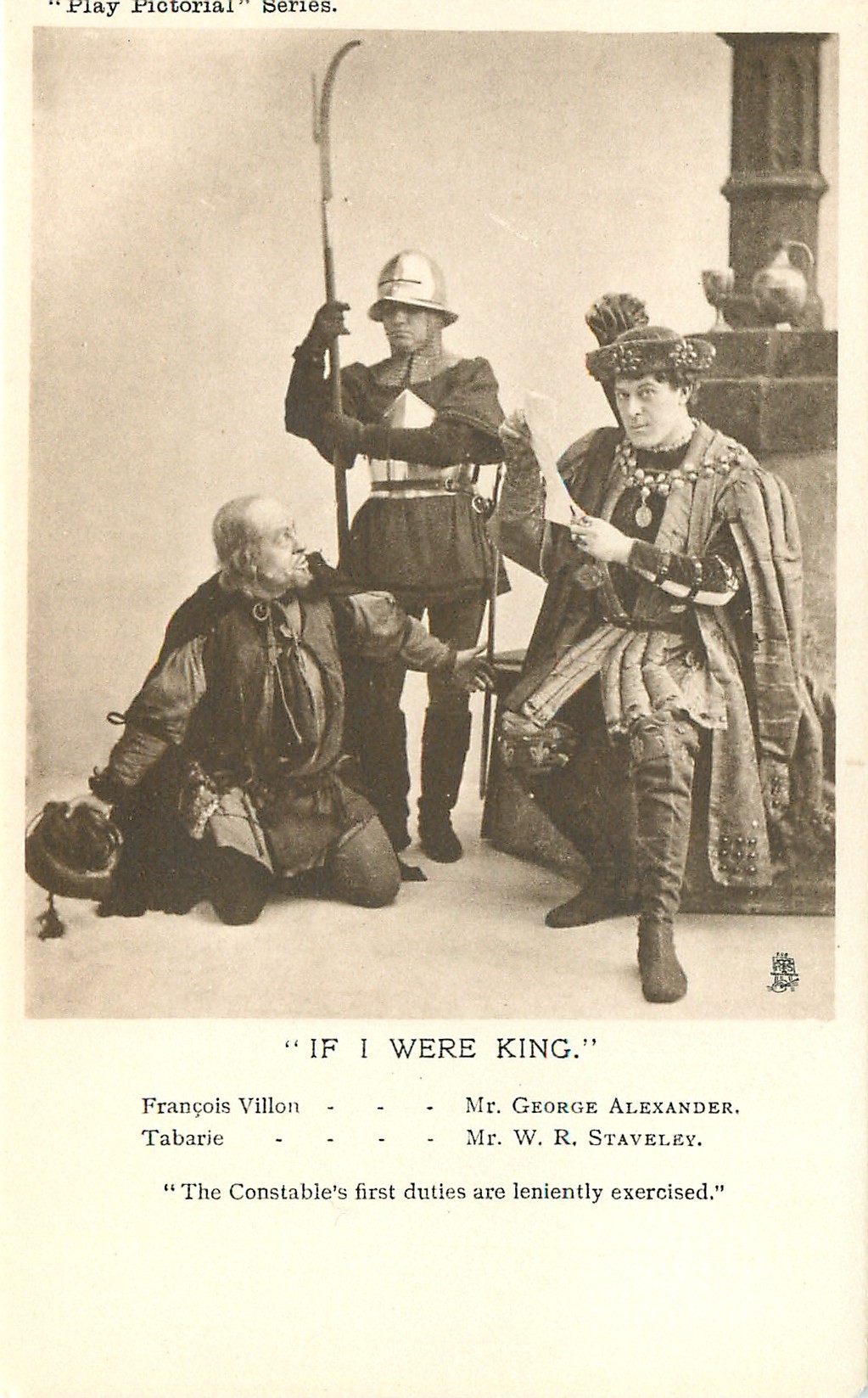 Full text on card front: "IF I WERE KING" FRANCOIS VILLON MR GEORGE ALEXANDER TABARIE MR W. R. STAVELEY "THE CONSTABLE'S FIRST DUTIES ARE LENIENTLY EXERCISED."