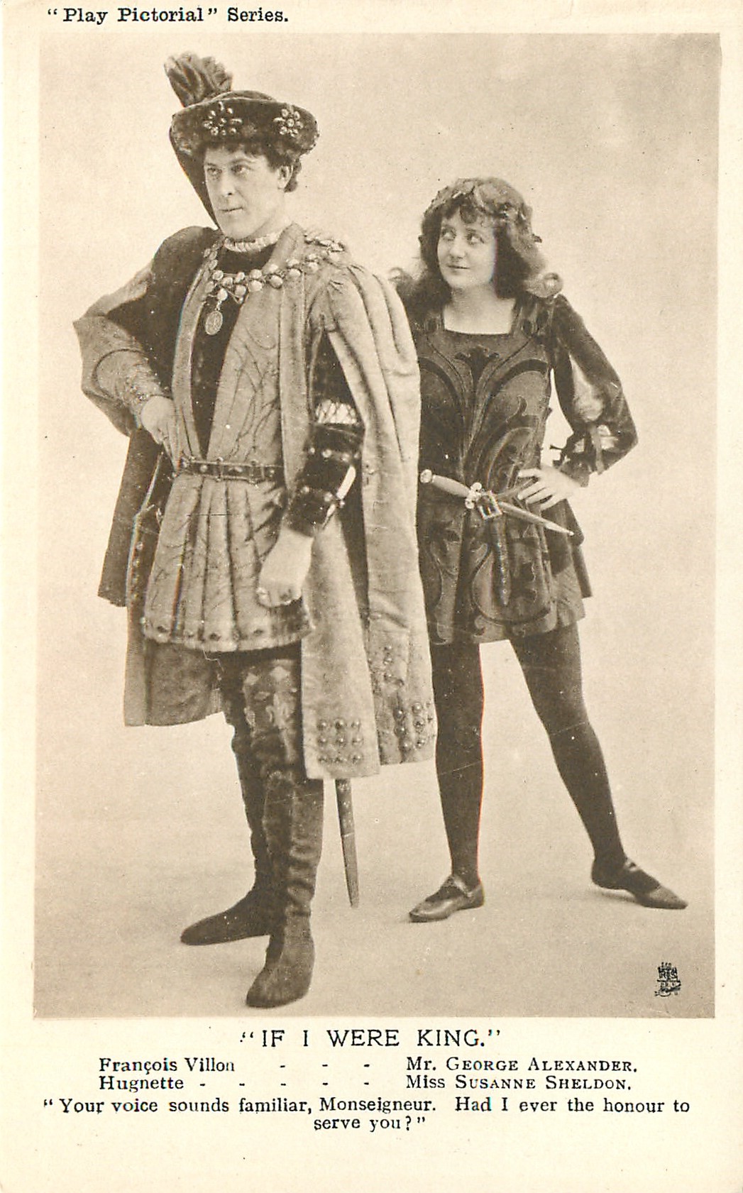 Full text on card front: FRANCOIS VILLON, MR. GEORGE ALEXANDER, HUGNETTE, MISS SUSANNE SHELDON "YOUR VOICE SOUNDS FAMILIAR, MONSEIGNEUR. HAD I EVER THE HONOUR TO SERVE YOU?"