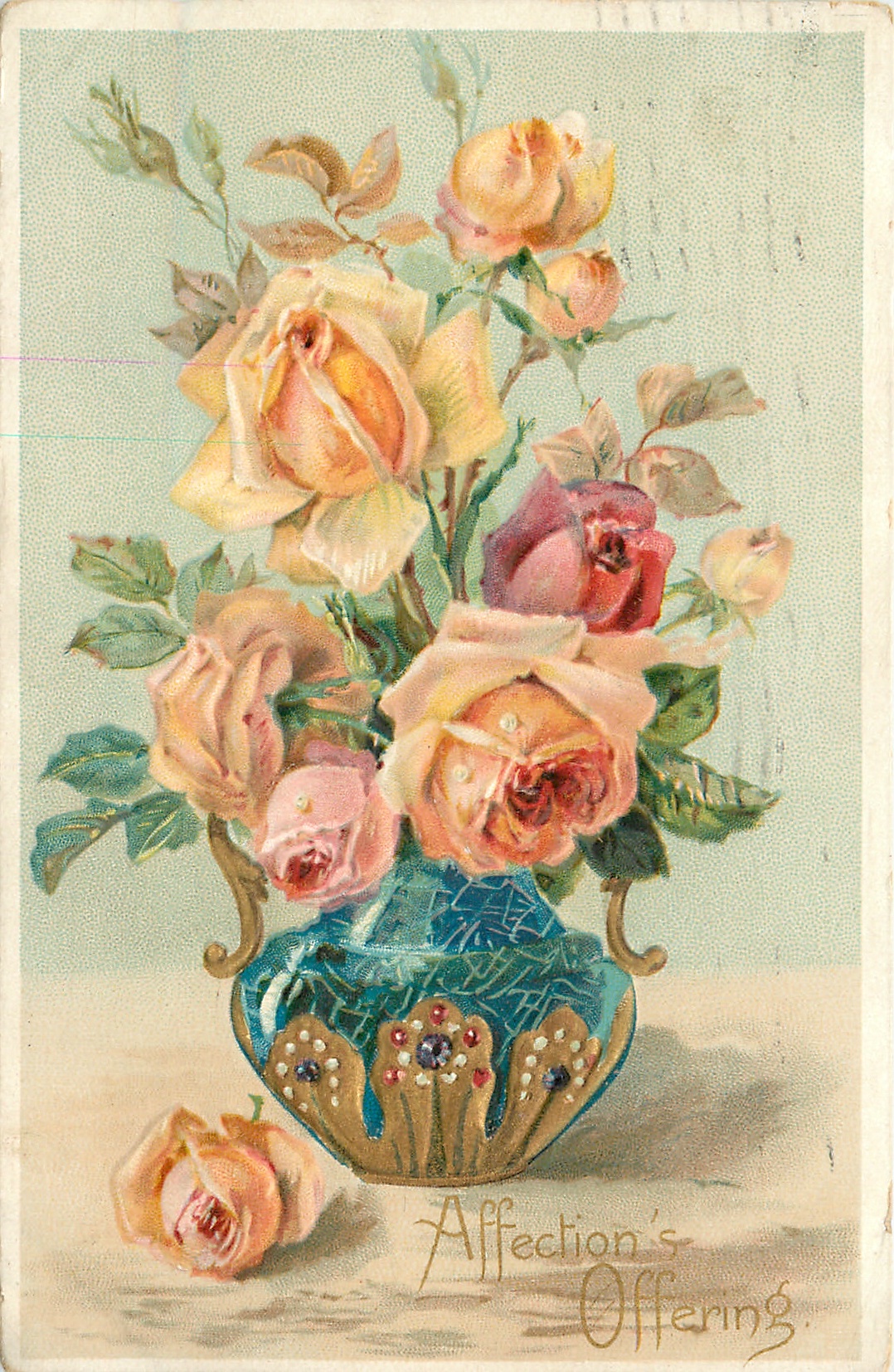 AFFECTION'S OFFERING green & gilt vase of mainly orange roses
