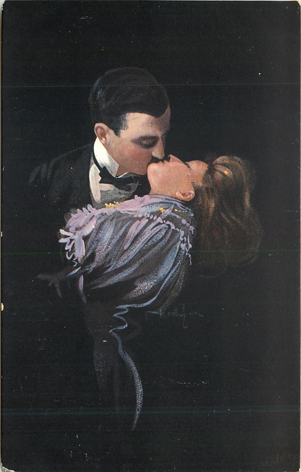man back left kisses woman in purple dress, woman faces left & leans back, her head perpendicular to his, black background