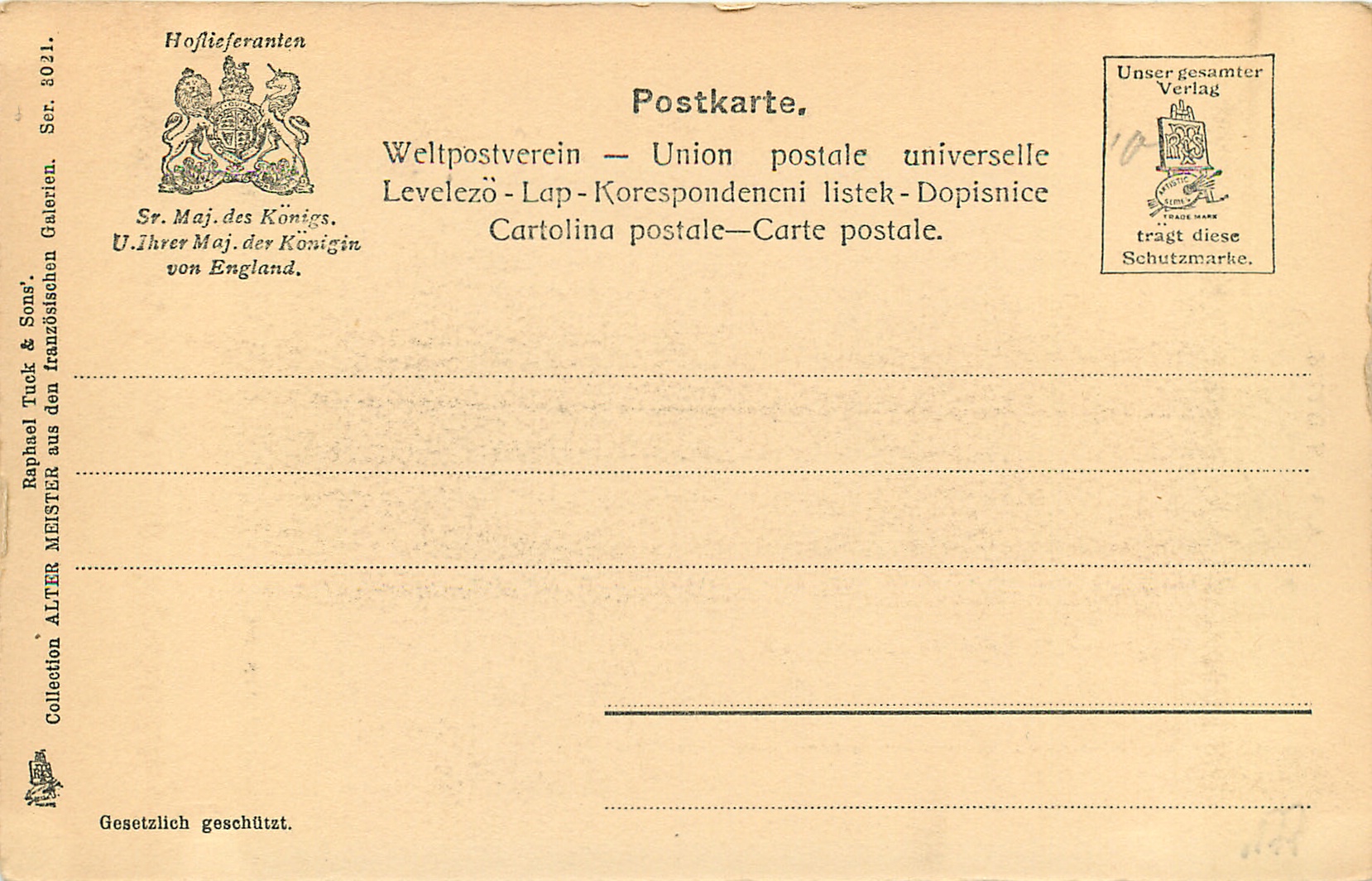 u/b, brown/purple, German/International backs, GESETZLICH GESCHUTZT, same images & numbers, French backs 3021 CHEFS D'OEUVRE DU MUSEE DU LOUVRE