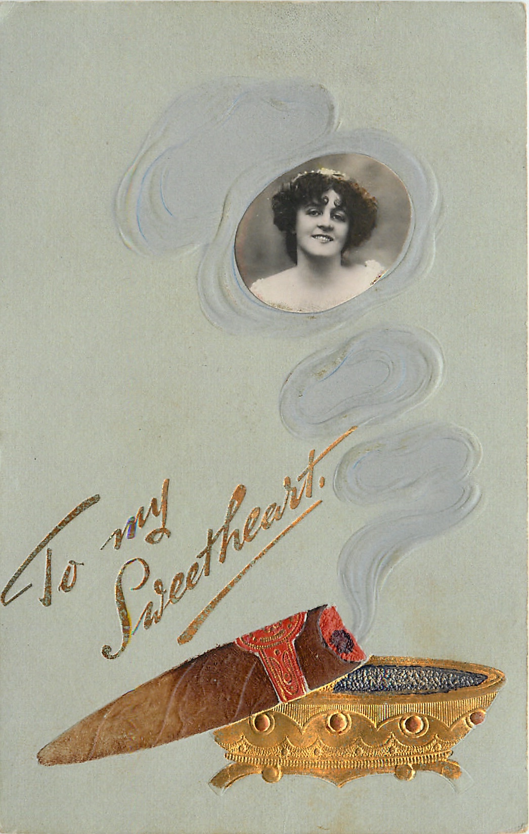 embossed front, PRODUCED IN GERMANY, photo insert of girl in smoke from cigar propped up on on gilt ash-tray, the photo insets come variously rotated, giving the appearance of a different card