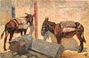 two donkeys stand behind rubble, one faces away, the other faces left