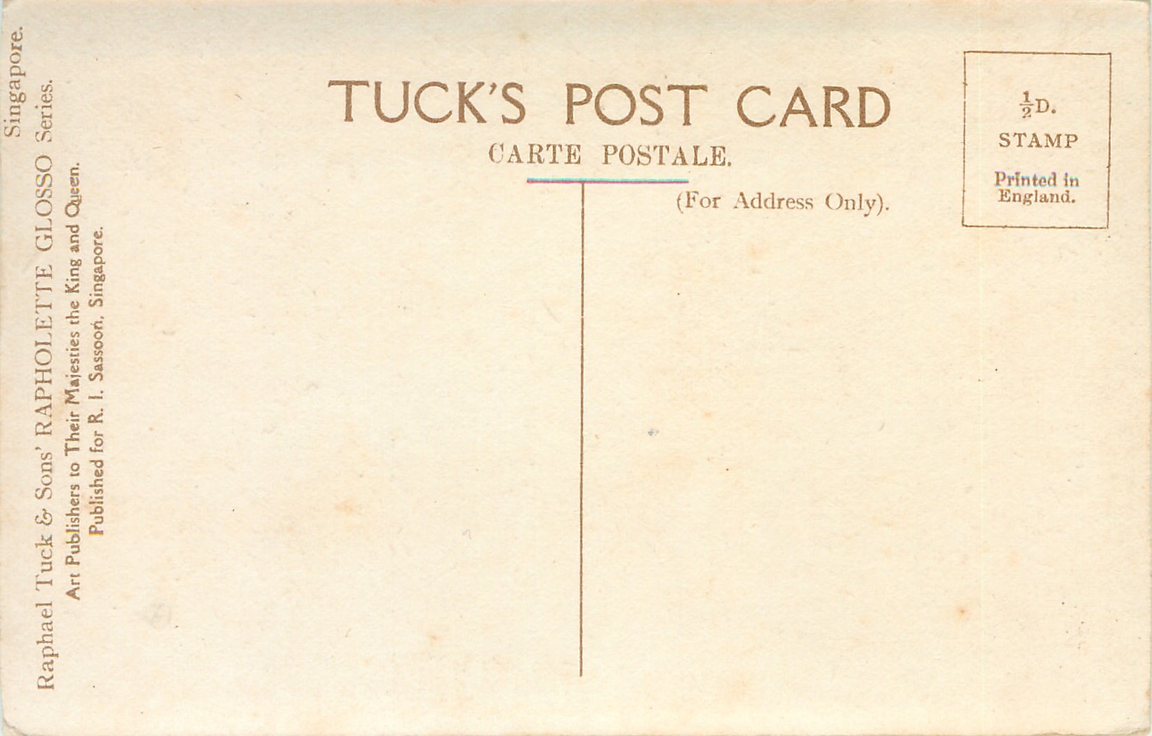 RAPHOLETTE GLOSSO, PRINTED IN ENGLAND (in stamp box), PUBLISHED FOR R.I. SASSOON, SINGAPORE