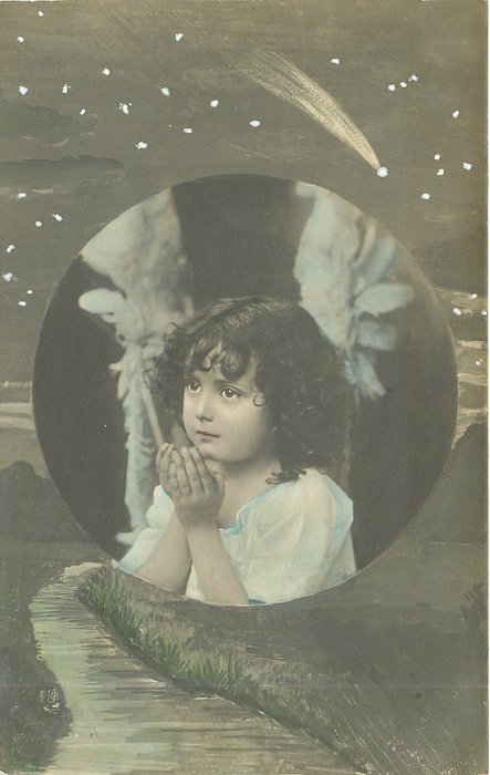 photographic circular inset, head & shoulders of small girl facing left, herhands cupped in front of her chin, star-lit scene